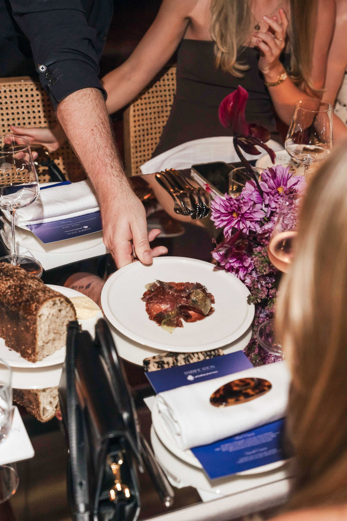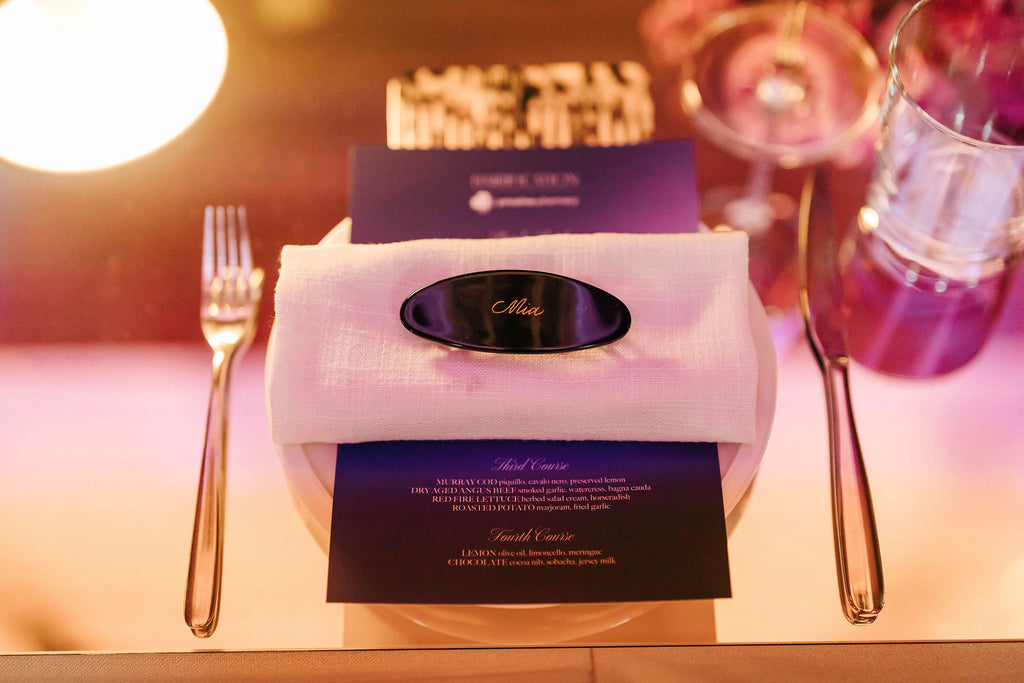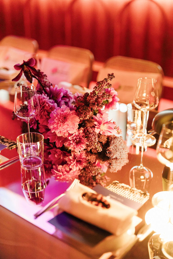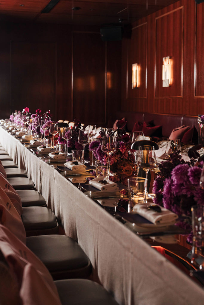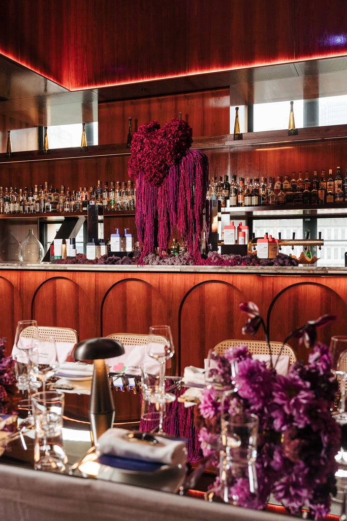 A custom mirrored table anchored the space, catching ceiling projections and multiplying branded moments infinitely. Florals designed to feel endless sculpted across the bar in waves of purple. Light bounced. Reflections layered. The space became kaleidoscopic.