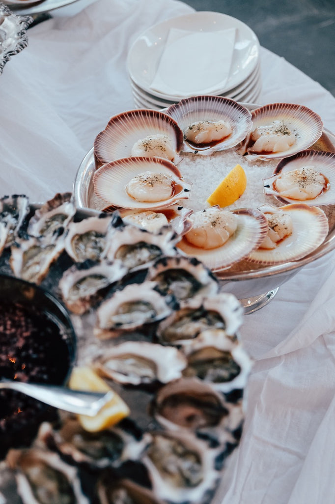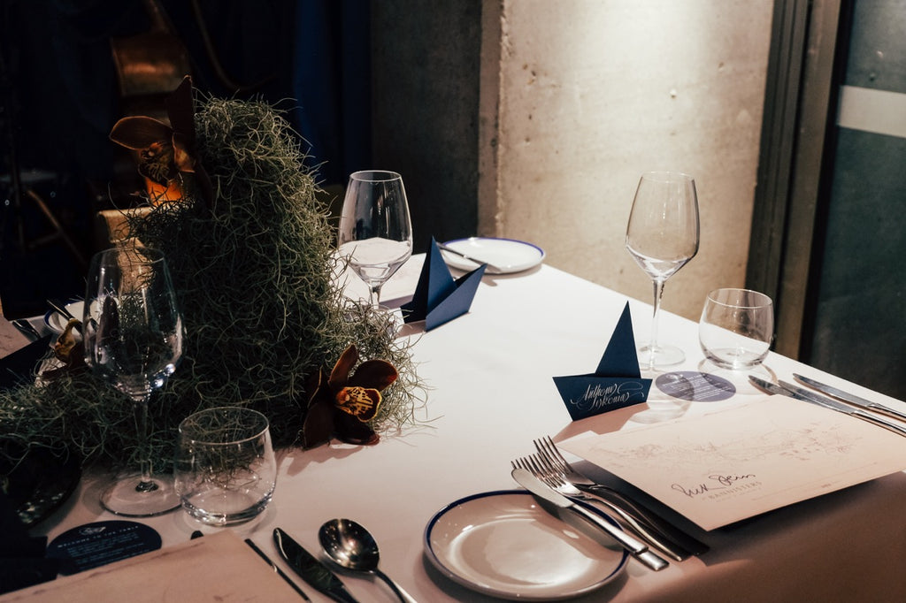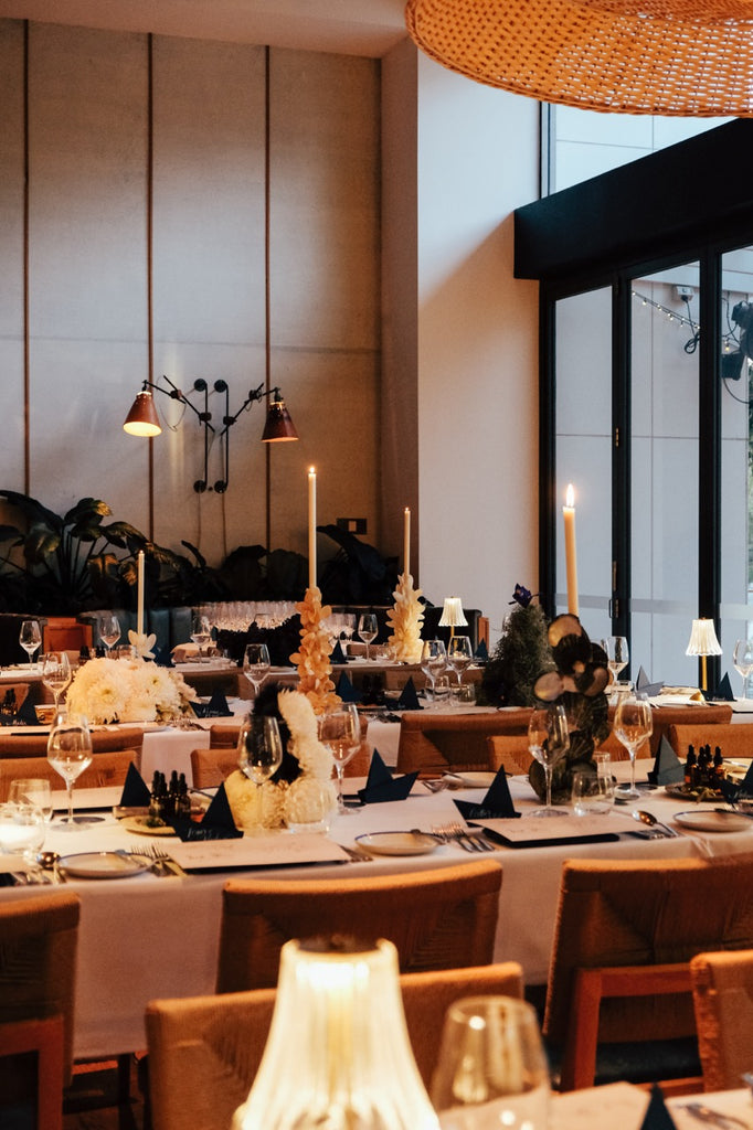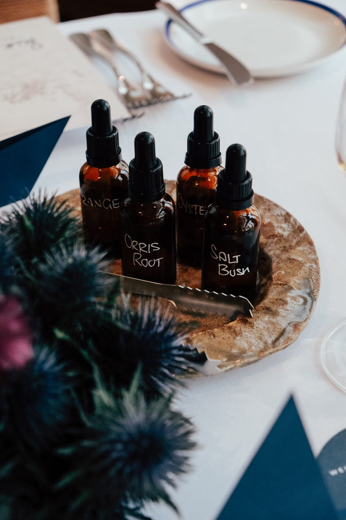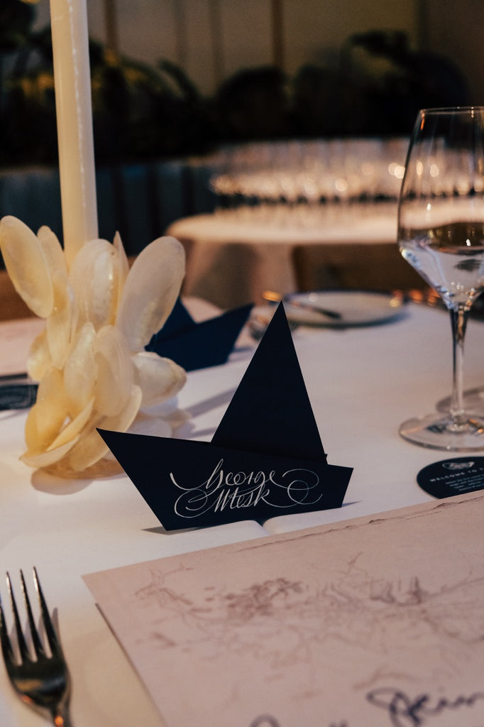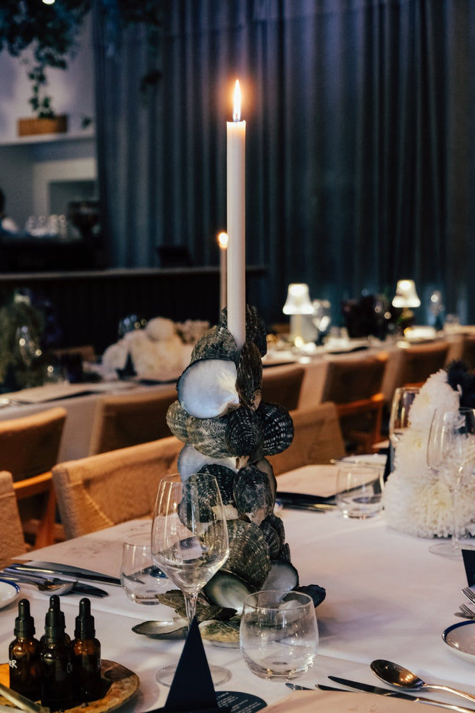 Guests arrived to a vibrant cocktail soirée centred around a 360° food station, where oysters, scallops and uni were served on silver platters, and champagne and cocktails flowed. Dinner unfolded in Rick Stein’s, reimagined with crisp white linens, brass accents, and florals and candles styled to echo coral forms and the botanicals of Bannister Gin. Eleven handcrafted candleholders from seashells, with place settings created from origami boats.